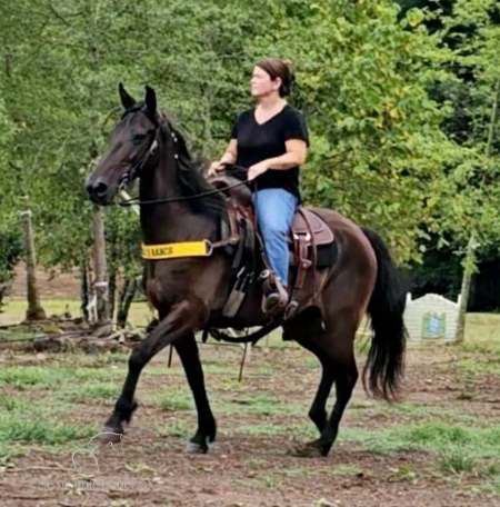 Ladoux is a black 11-year-old Tennessee Walking Horse gelding that stands 14.3 hands tall. He is a seasoned trail horse that knows and enjoys his job.