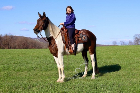 Cheyenne is a 13-year-old Bay and White Spotted Saddle Mare standing at 15.1 hands. She is the safest, most solid ride you could ever find! A true pleasure on the trails, she has a nice neck rein and the softest, smoothest lope you can imagine. Cheyenne has been trail-ridden by a six-year-old girl who confidently lopes her everywhere on her own. She’s also taken care of riders up to 79 years old, always steady and dependable. We’ve used her to pony 2-year-old colts, helping them learn to travel quietly down the trail. She’s a fantastic babysitter! She stands quietly for the farrier, is easy to clip and bathe, ties anywhere, and always loads perfectly in the trailer. Cheyenne has been on numerous overnight camping trips and is completely comfortable on the tie line. If you’re looking for that truly special horse that lets you relax and enjoy the ride always feeling safe and secure Cheyenne is your gal. She’s a true saint, and they just don’t come any better. Please feel free to reach out with any questions or to schedule a visit to meet Cheyenne. We can also help arrange nationwide shipping.