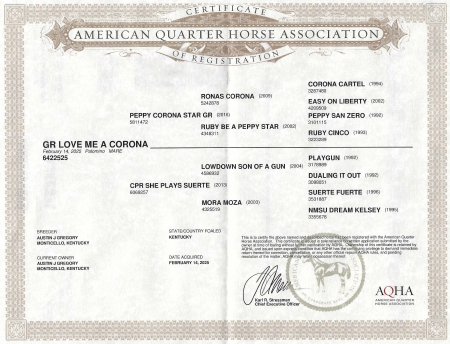 Her sire “Peppy Corona Star GR” is 15.2 hands, his sire “Ronas Corona” SI 97 race winner, and Grandson of “Corona Cartel” AQHA Race SI-97/AAA/ROM/SW, 14-6-3-0, $557,142. He is a grandson of the great stallion, “Peppy San Badger” AQHA & NCHA Hall of Fame. Speed & Foundation