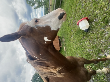 Charlie; 2 year old Paint, bought her as a young filly. Did do 60 days away at a training facility where she did well with lunging, trotting with saddle and rider while lead. I have recently gone through divorce and with 4 kids don\'t have the time to give her proper training as I may need to downsize homestead to keep house. Wonderful well behaved. She is a lover, stands well for Ferrier. Will need retouch of saddle and lunging. I have lunged her a bit at home does well but will need to work back up to weight on her.