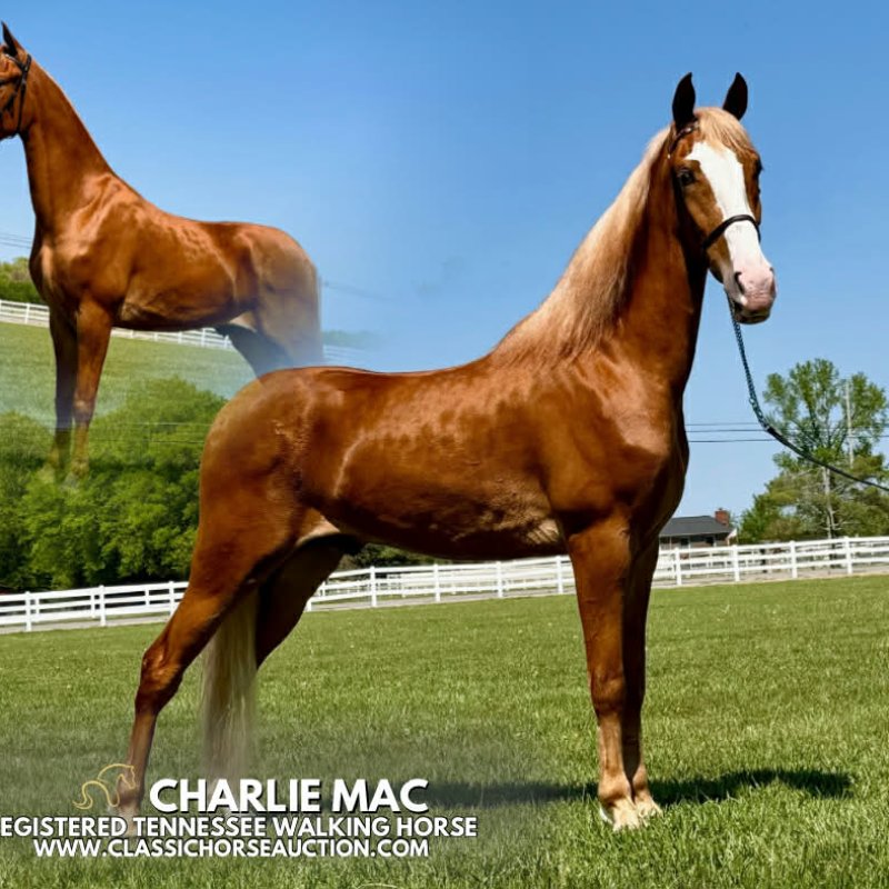 WWW. CLASSICHORSEAUCTION. COM THIS HORSE IS LOCATED: Lewisburg, TN Buy Now Price: 15000 To view health docs, see consignor’s info, how to schedule a meeting to try it out, visit our site www.classichorseauction.com Charlie Mac is a sharp looking 3-year-old registered Tennessee Walking Horse gelding with a natural presence and a solid, well put together build that catches your eye right away. He carries himself with confidence, a kind expression, and the balance you like to see in a quality trail horse. He is broke to ride and drive, giving him that added versatility that sets him apart. Charlie Mac stands quietly at the mounting block, handles himself well in everyday situations, and has respectful, easy ground manners that make him a pleasure to be around in and out of the barn. Charlie Mac really shines when it comes to driving. He hooks up easily, stands patiently while being harnessed, and steps off quiet and willing every time. He is confident and steady in the buggy, handles stop and go situations smoothly, and backs with ease. He stays calm and collected whether you’re driving down the road or around the farm, showing the kind of mind and training that is getting harder to find. He has been exposed to everyday traffic and commotion and takes it all in stride, making him a dependable and enjoyable driving partner. Under saddle, Charlie Mac is smooth, willing, and attentive with a steady, easy way of going. He rides out confidently on the trail and is the kind you can enjoy right now! If you’re looking for a solid trail partner, Charlie Mac is your horse! Justin Jenne’ 931-224-2968 Lewisburg, TN