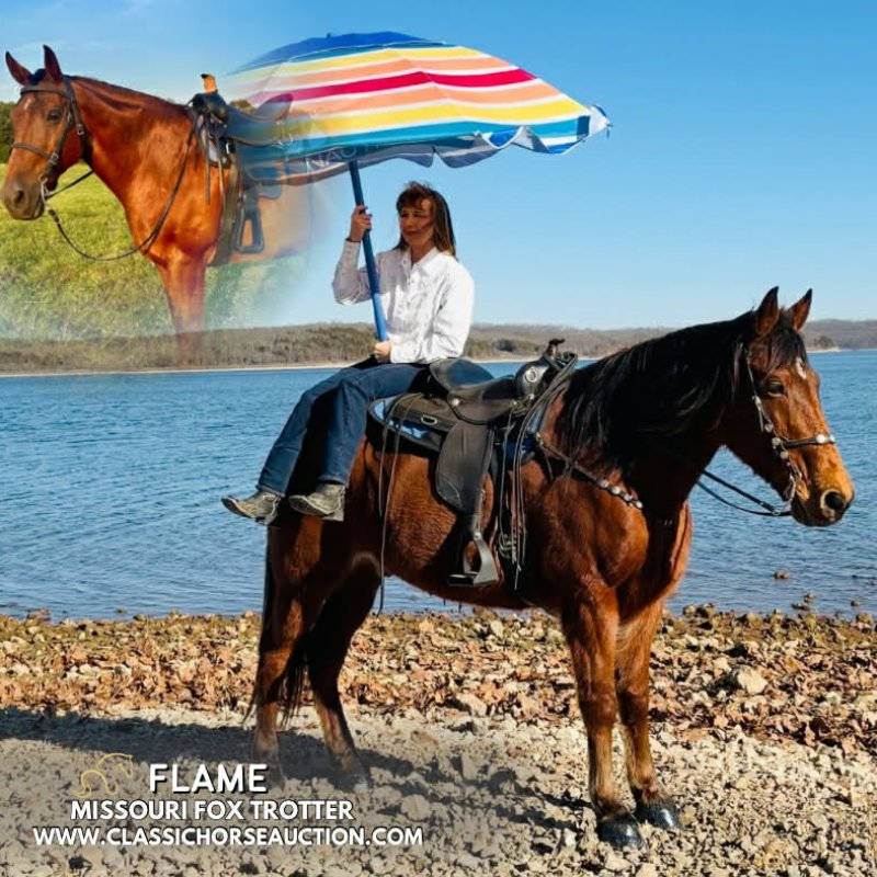 WWW. CLASSICHORSEAUCTION. COM THIS HORSE IS LOCATED: Everton, MO Buy Now Price:16500 To view health docs, see consignor’s info, how to schedule a meeting to try it out, visit our site www.classichorseauction.com Flame , 15.1 hh 13yo Missouri Foxtrotter gelding, located in Everton, Missouri. Flame is a trail horse suited for riders of all experience levels seeking a safe and dependable partner. He is a registered red bay gelding with a stout build, strong bone, and a calm, quiet disposition. He rides on a loose rein and is content to travel at a relaxed walk, or will move easily into a smooth, natural foxtrot when asked. Flame is a confident, point-and-go type horse that provides a comfortable and enjoyable ride. He is traffic safe and remains steady around trucks and highway conditions. On the trail, he confidently crosses water, rivers, and rough terrain while maintaining a relaxed attitude. On the ground, Flame is gentle, easygoing, and a pleasure to handle, making him a reliable everyday partner. Everton, MO EMILY 615-542-4564
