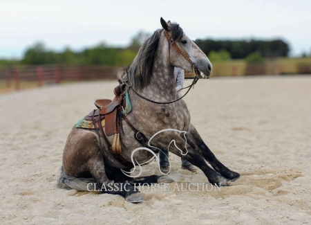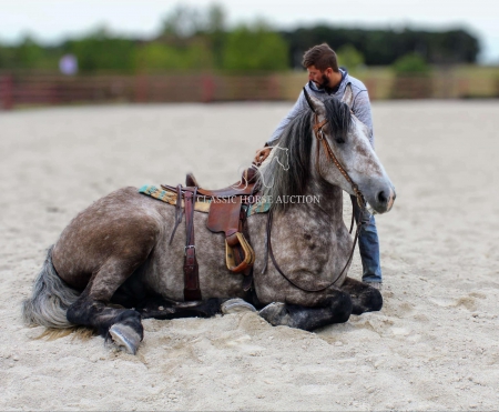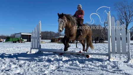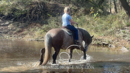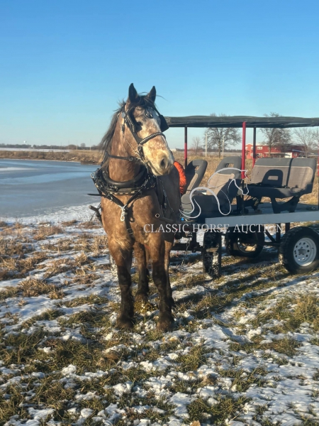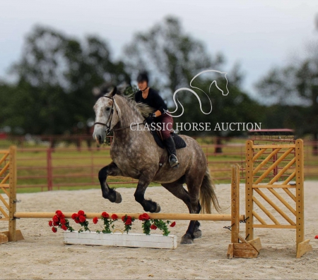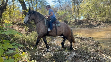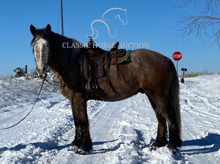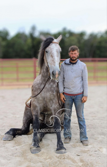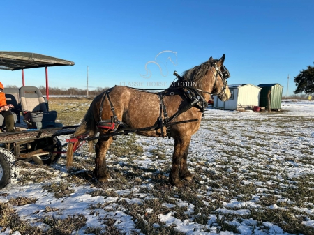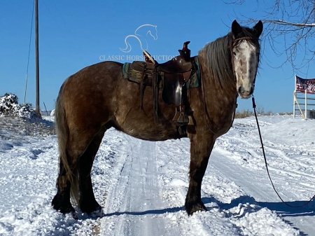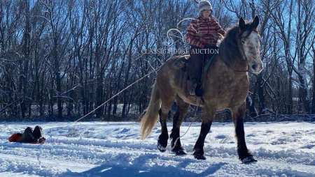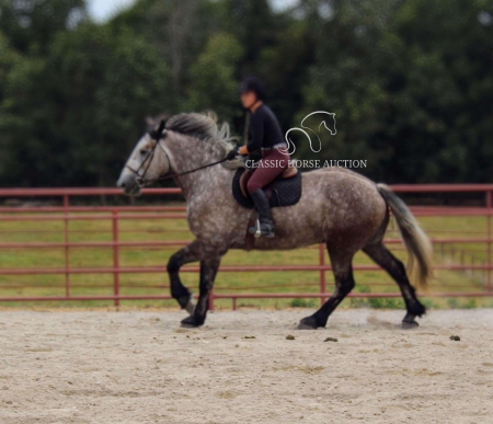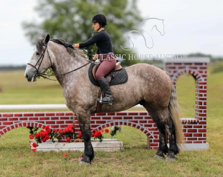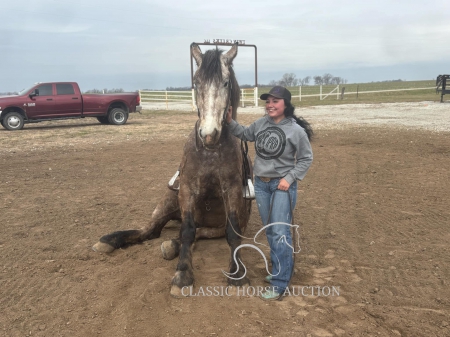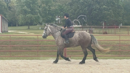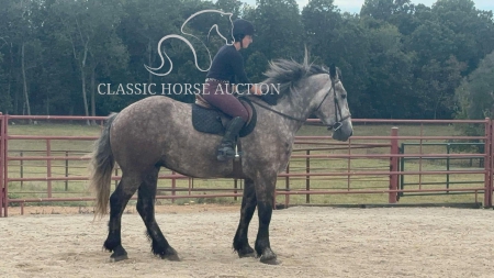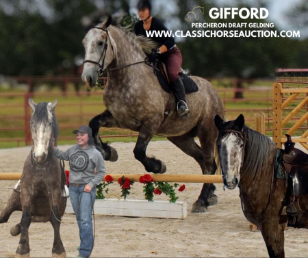 WWW. CLASSICHORSEAUCTION. COM THIS HOSE IS LOCATED: Sheldon, MO CURRENT BID: 4000 BUY NOW: 20000 To view health docs, see consignor’s info, how to schedule a meeting to try it out, visit our site.. https://classichorseauction.com/auctions/gifford/ VIDEO>> https://youtu.be/ae1Q3TbFhAk “Gifford” 5 yr-old Percheron gelding, standing a stout 17 hh. Absolutely safe for the whole family! Athletic enough for the fun stuff, quiet enough for the husband! Gifford was raised and started by a great Amish family, then I purchased him and started putting lots of outside miles on trails, jumps, highways, dirt roads in town and country on him. He also drives single & double, 100% traffic safe! Gifford has been exposed to tarps, whips, balls, dogs, cats, ducks, sheep, goats & chickens and been ridden around 4 wheelers, ATVs etc! Gifford leads, loads, ties as he should, absolutely no holes, vices or issues, no blemishes! He is smooth at all gates! Gifford has been ridden in an arena setting. He is outstanding in both English or Western. He also stands perfect for a farrier. Gifford has a few neat tricks! He can lay down and sit like a loving puppy. He will set up over to the mounting block. You can pull from the saddle horn with Gifford! Nothing will shake him. He has been used extensively on cattle, penning back at a sale barn. Gifford loves people, he is a big kind teddy bear type! He lives in a dry lot here with good grass round bale and a chunk of alfalfa in the morning. He never has any known soundness or sickness issues, has a fresh wellness check &negative coggins teeth floated. Sheldon, MO Emily 615-542-4564 Nationwide Shipping Assistance Available Classic Horse Auction 931-224-2968