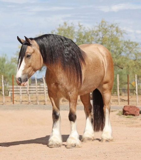 In search of your Heart Horse? A special one that touches your soul and steals your heart. Your search is over, here is your Prince Charming… We have had April since a yearling and he’s never been anywhere else but in our care. NOTE: Contact us only on our website or #; https://www.horsesranch.com/ , www.horsesranch.com/ , https://www.horsesranch.com/horses-for-sale , drop me a line/chat; (956) 2I5 - OI4O for more information.. WE DO SHIP. We have amazing offers now! Purchase 3+ Horses and we will ship all for FREE. All our horses come with a 30 days Money-Back Guarantee! He was kind of a late bloomer, but flourished as a four year old. This Gypsy gelding is absolutely ASTONISHING! He is as balanced and correct as you will find in conformation and has a babydoll head. I am extremely proud and personally attached to this handsome boy and he will be a hard one to let go of. April is the most beautiful BUCKSKIN color with four perfectly matched socks and an equally portioned blazed face.