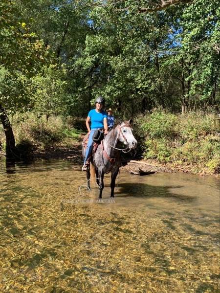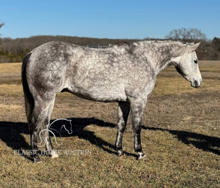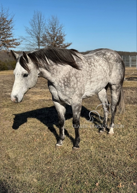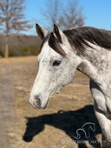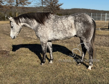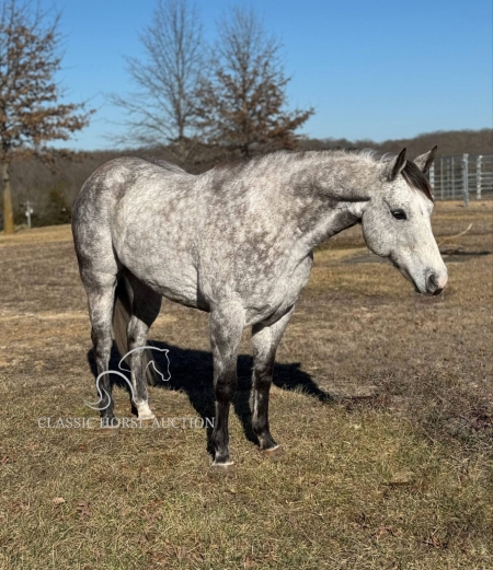 WWW. CLASSICHORSEAUCTION. COM THIS HOSE IS LOCATED Vichy, MO To view health docs, see consignor’s info, how to schedule a meeting to try it out, visit our site.. https://classichorseauction.com/auctions/pete-2/ VIDEO - https://youtu.be/-PiAgjPomLE ++++ SKIP THE AUCTION PRICE AVAILABLE ++++ Pete is a registered 10-year-old gelding, standing 15.2 hands high and he’s as wide as he is tall! This stunning dapple grey has experience in hunter-jumpers, ranch riding, and has been trail ridden all over. He’s got a nice one-handed neck rein, a bit of turnaround, side passes, lead changes, and a solid “whoa.” He’ll cross anything you point him at and would love to have a job. Pete is forward-moving and handy broke, so he’s not for beginners. He’s not the type to just plod along nose-to-tail. He’d make an excellent ranch horse, or could even be a fantastic prospect for barrels or roping. He’s not buddy sour, goes wherever you ask without fuss, and has no buck or rear. This gelding has grit, drive, and a desire to work. Pete is sound and healthy in every way. He’s up to date on Coggins and shots, just had chiropractic work done, and has fresh shoes with feet in great shape. He’s an easy keeper and absolutely gorgeous to boot! He’s a sweetheart to be around, with excellent ground manners and a kind personality. He stands tied all day without issue, is great for the farrier, clips easily, and enjoys a bath in the wash rack. Pete is ready for his next forever home. He’s got a lot to give! Vichy, MO Emily 615-542-4564
