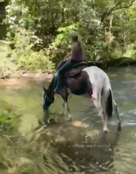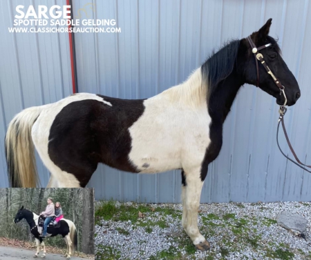WWW. CLASSICHORSEAUCTION. COM THIS HOSE IS LOCATED Oneida, TN SKIP THE AUCTION PRICE: 5500 CURRENT BID: 3000 To view health docs, see consignor’s info, how to schedule a meeting to try it out, visit our site.. https://classichorseauction.com/auctions/sarge/ VIDEO >> https://youtu.be/WTUt14I-hag A strong 14.2hh, 8 year old Spotted Saddle Gelding. Sarge is a well-mannered, easygoing gelding with a smooth gait and a great attitude. He loads, clips, shoes, and bathes without issue. In the pasture, he’s middle of the pack and gets along well with other horses. Under saddle, Sarge is versatile. He’ll ride comfortably in the front, middle, or back of a group without getting hot. He’s wearing four keg shoes and is completely spook-free. Perfect for anyone with basic horse experience, he’s also safe enough to carry a child. Sarge confidently crosses water, mud, and logs and has been exposed to farm equipment and ATVs. He saddles and bridles easily, making him a hassle free ride for anyone looking for a dependable, smooth-gaited trail horse. Oneida, TN Emily 615-542-4564 Classic Horse Auction 931-224-2968