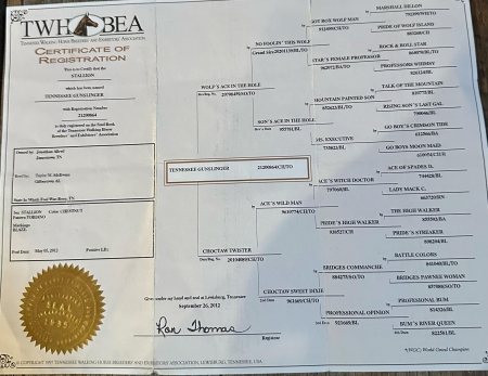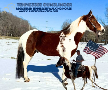 WWW. CLASSICHORSEAUCTION. COM THIS HOSE IS LOCATED Moscow, OH SKIP THE AUCTION PRICE: 9000 CURRENT BID: 3500 To view health docs, see consignor’s info, how to schedule a meeting to try it out, visit our site.. https://classichorseauction.com/auctions/tennessee-gunslinger/ VIDEO >> https://youtu.be/qC9RdRH2Ql4 Tennessee Gunslinger is a gorgeous, registered Tennessee Walking Horse gelding. He is 13 years old and stands just over 15.1 hands tall. This exceptionally nice gelding has logged countless trail miles across various terrains, proving himself to be both trustworthy and consistent. Gunslinger has a smooth, natural gait that is comfortable and easy to sit. He is well-built, sturdy, and moves forward willingly while remaining easy to control. He will walk when asked, transition smoothly into his gait, and has a nice canter on command. He loves to cover ground when requested, is easy to handle, and enjoys being around people. Overall, Gunslinger is an outstanding horse with a great temperament. Moscow, OH Emily 615-542-4564 Classic Horse Auction 931-224-2968