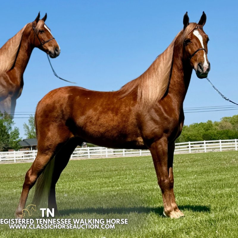 WWW. CLASSICHORSEAUCTION. COM THIS HORSE IS LOCATED: Lewisburg, TN Buy Now Price: 15000 To view health docs, see consignor’s info, how to schedule a meeting to try it out, visit our site www.classichorseauction.com Meet TN, a handsome Tennessee Walking Horse gelding with a rich sorrel coat and a beautiful flaxen mane and tail that is sure to turn heads wherever he goes. Standing 15.1HH and 4 years old, TN carries himself with presence and style. He has excellent ground manners and is a pleasure to be around. TN stands quietly for grooming, saddling, mounting, and dismounting, making him easy and enjoyable both in and out of the barn. He’s respectful, willing, and handles like a true gentleman. Out on the trail is where TN truly shines. He is a confident and dependable trail horse with a calm, easygoing attitude. TN is sure-footed, steady, and always focused on his rider, making every ride smooth and relaxing. He handles the trails with ease and is happy to go wherever he’s asked. If you’re looking for a beautiful, trustworthy, and enjoyable trail partner, TN is the kind that makes every mile a good one. Justin Jenne’ 931-224-2968 Lewisburg, TN